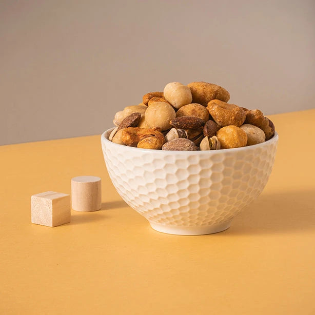 Ce mélange supplémentaire comprend des pistaches (Kharouf grillées, Kharouf salées, piquantes et au curry), des noix de macadamia , des noix de cajou (truffe, soja, fromage, salées et pimentées), des amandes (américaines demi-salées, espagnoles demi-salées, citronnées, piquantes, krikri et fumées) et des noisettes (pelées et salées). Chaque ingrédient apportant une saveur et une texture uniques , chaque portion offre un équilibre parfait entre goût et croquant.